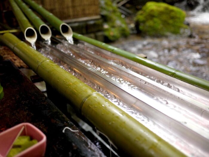 竹子加上金屬製的滑水道讓麵迅雷不急掩耳的通過,請一定要眼明手快,麵一過就不會回來了!提供川床流水細麵的餐廳「ひろ文」原是當地著名的川床料理餐廳,不過川床料理套餐價錢甚高,並不是能夠輕易享用,於是另外搭建了能提供較低單價且符合夏天涼意的流水細麵,讓來到這邊的人們能夠有更多的選擇,但也因為這樣特別的創意非常受到歡迎,平均得要等上兩小時才吃得到麵呢!