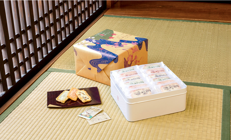 再來是用小倉百人一首作為菓子發想的「小倉山莊」,其中最推薦的商品是印刷著小倉百人一首圖案的仙貝組合,不禁價錢便宜、重量又輕,而且包裝非常可愛,還有每個人都能拿到不一樣的包裝趣味,作為公司辦手禮再適合也不過了。