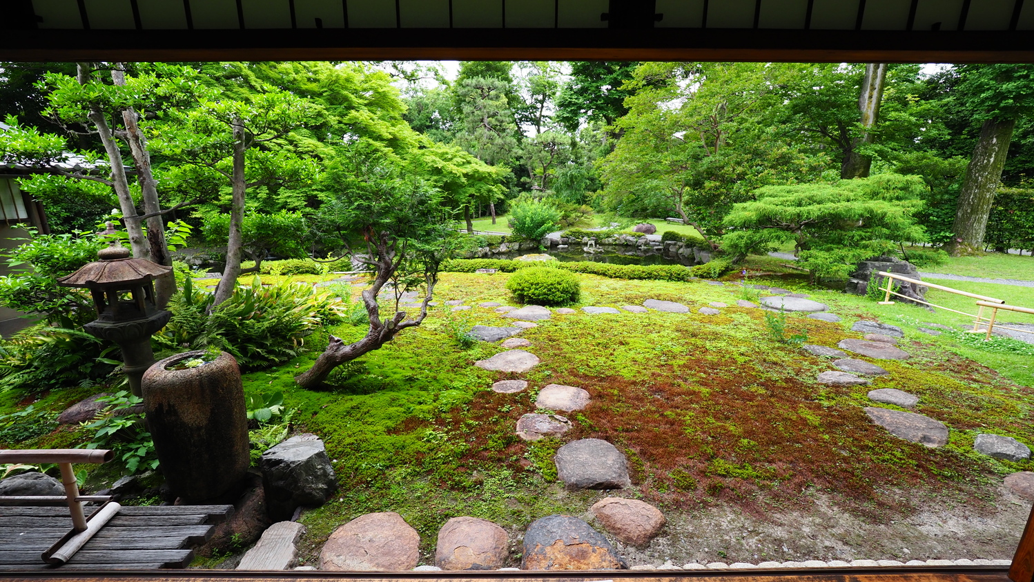 參觀完建築內部,能夠來到了廣大的庭園本身,掛在簷廊的風鈴讓夏天的戶外增添了一些涼意,流水與岩石的組合還有樹木的陰影讓庭園充滿著層次,而秋季也有二樓特別公開的期間,如果剛好在期間內來到這邊,請務必在二樓的陽台眺望庭園,享受當時富豪門的風流。