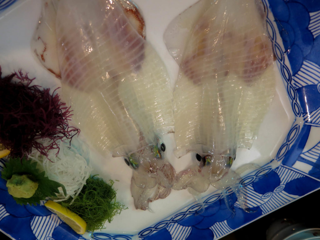 看著這花枝狠狠瞪著筆者總覺得有種於心不忍,尤其筷子滑過花枝的透明的身體是還會看到牠因為受到刺激而變色,真的是非常的新鮮!平常我們在日本料理店吃到的花枝都是白色的,代表花枝死去已經有一段時間了,但在這裡的花枝則是現撈,相當新鮮,更可說是「生鮮」啦!