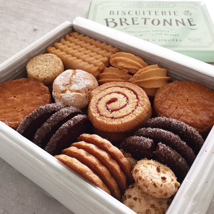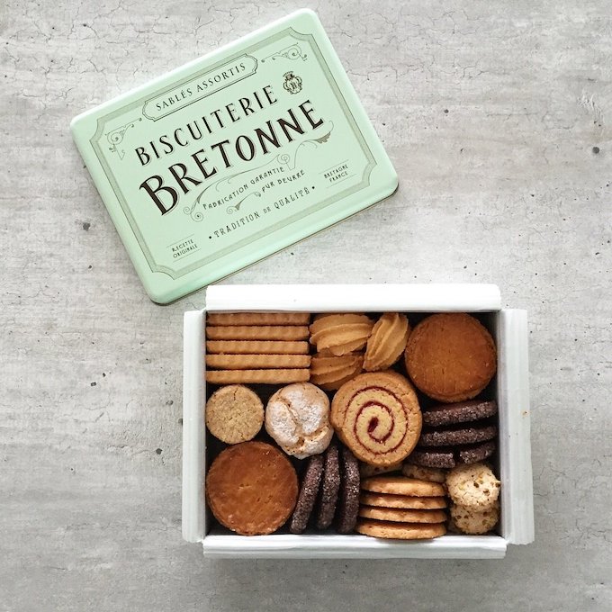 BISCUITERIE BRETONNE 走一個鄉村路線,除了瑪德蓮與費南雪之外,他們的小餅乾、磅蛋糕、布列塔尼、可麗露等常溫蛋糕也是超熱賣款!餅乾鐵盒以淡淡的青蘋果綠與歐式的插圖設計,小盒裝的一共有九種口味,多屬於法式作法的餅乾,像是開心果風味的蛋白餅、濃厚發酵奶油香與朗姆酒香的厚燒奶油餅、杏仁榛果餅乾、擠花餅乾等等,每個都各有特色、都好吃!