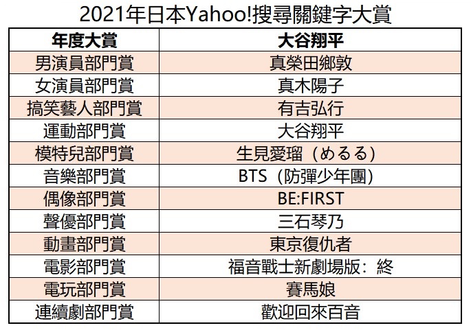日本入口網站年度最大盛事「Yahoo!搜尋關鍵字大賞2021」在12月9日凌晨公布了得獎名單,依照藝人、體育明星以及視聽作品、遊戲等12大部門,頒發了各領域前十名的年度最火紅話題。2021年搜尋關鍵字大賞由在美國職棒大聯盟締造百年難得一見佳績的「二刀流」大谷翔平拿下冠軍,並獲得運動演員部門賞第一名,可說是今年度最火紅的話題名人,其他如知名作品《東京復仇者》、《呪術迴戰》都榜上有名,來看看介紹吧!