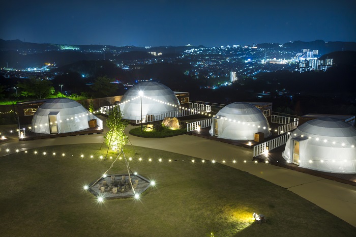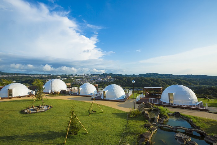 位在距離三宮約20分車程的北神戶箕谷地區高台上的「GLAMP DOME 神戶天空」,境內有9座可容納2~4人的38平方米大型營帳以及2座可容納4~10人80平方米大型營帳,適合家族共遊!周邊環繞大自然無遮蔽物,每座營帳均可望盡火紅夕陽及絕美夜景和星空。