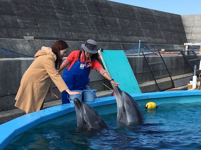 ■費用:①哈囉海豚(基本費用)大人500円 小孩400円、②餵食海豚 ①加600円、③訓練師體驗 ①加2000円、④海豚共泳 ①加大人9000円 小孩7500円