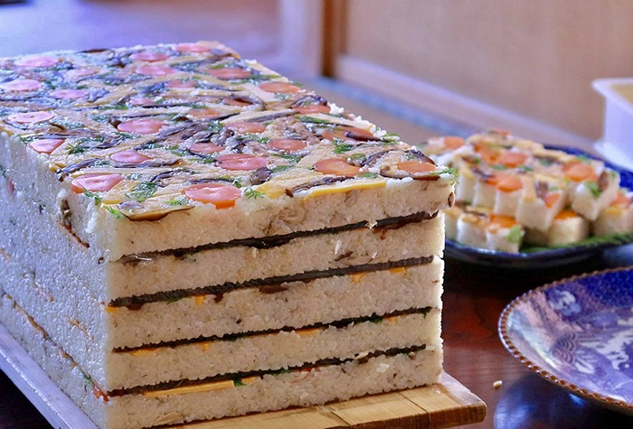 來到高知縣東洋町不能錯過宛如寶石盒繽紛的在地鄉土料理「木屑壽司(こけら寿司)」。其美味的三大特色在於,使用在地生產生柚汁做成的醋飯、拌入烤魚增香、佐以色彩繽紛的季節食材,香菇、紅蘿蔔、薄煎蛋及蘿蔔葉等,層層堆疊放入木箱內製成押壽司,鮮艷繽紛令人食指大動,也是在地祝賀場合時,象徵好兆頭的料理呢!