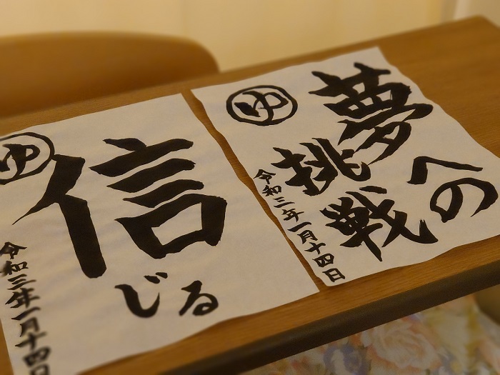 這天還有一個活動便是『新年書法(書き初め)』,一般作法是使用一月一日汲取的水,面對惠方(諸事大吉的方位)以筆墨寫下詩歌。