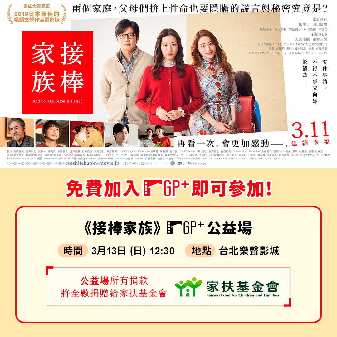 《接棒家族》故事背後的意義也讓人省思,這次更特別與家扶基金會合作,將於3月13日在台北樂聲影城舉辦《接棒家族》GP+公益場,即日起只要是GP+會員(包含免費體驗會員)皆可免費訂票參加,並可以在訂票網頁上「自由樂捐」,捐款金額將全數捐給家扶基金會,無捐款亦可參加本場活動,邀請大家在被電影感動之餘,一起在生活中幫助有需要的小朋友。