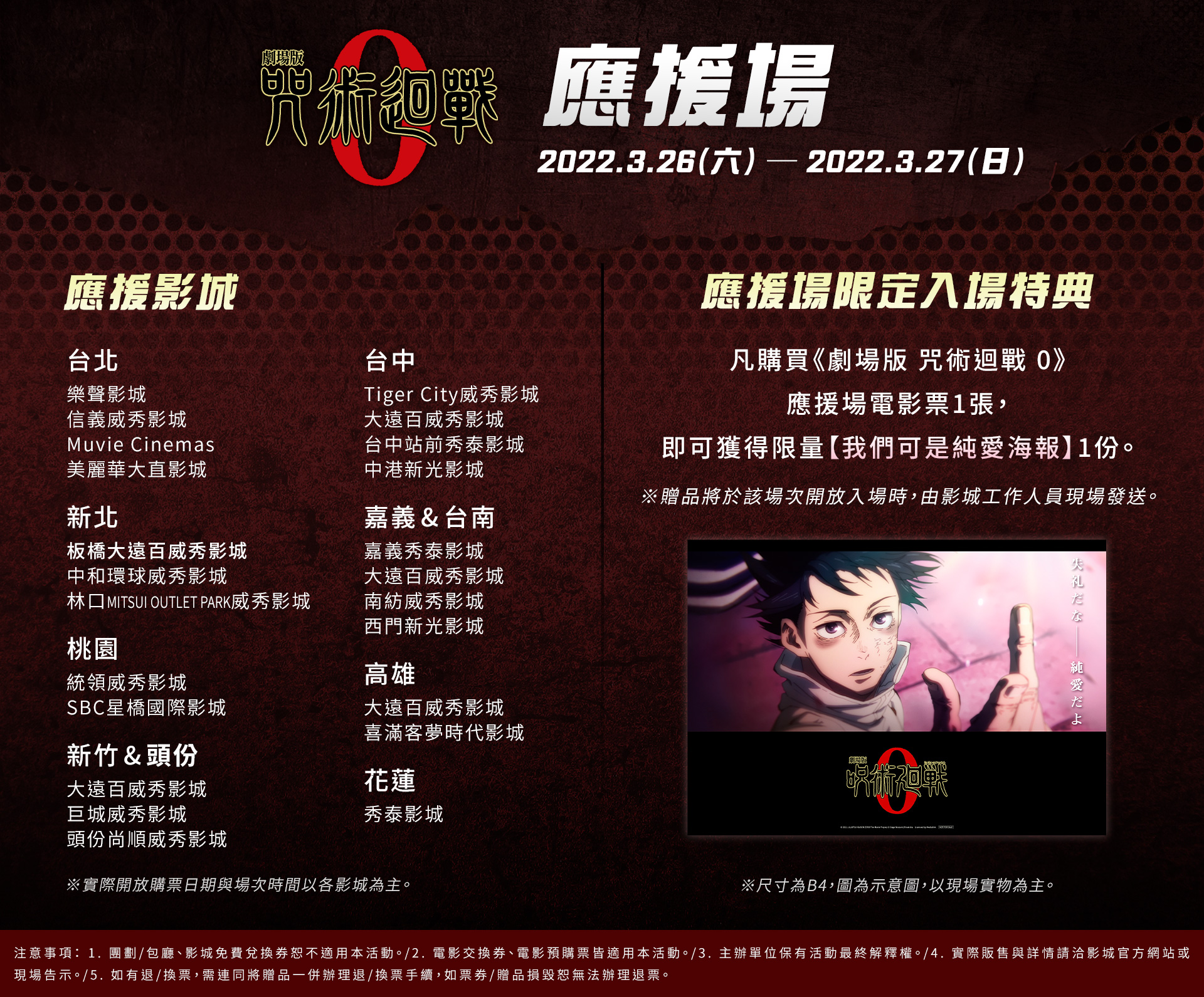 《劇場版 咒術迴戰 0》在本周末於全台合作戲院增開應援場次,電影公司也特別準備了獨家「我們可是純愛」B4海報作為應援場限定贈品,只要參加《劇場版 咒術迴戰 0》應援場場次,於入場時即可憑票領取《劇場版 咒術迴戰 0》應援場限定B4「我們可是純愛海報」乙張,數量有限,送完為止,活動詳情請洽各大合作影城現場公告,想要一起「應援」的觀眾們可以選擇應援場盡情同歡。(詳細場次依照各影城公布為準)!