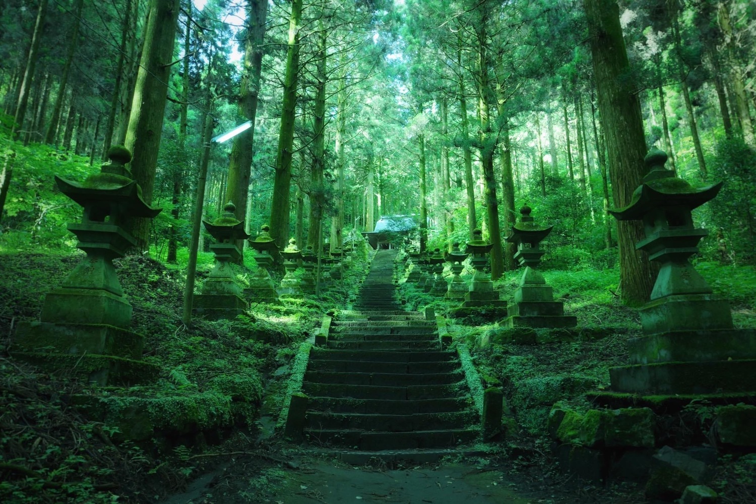 人煙罕至、帶有異世界入口氛圍的上色見熊野座神社,位在熊本縣高森町,於南阿蘇與宮崎縣高千穗町的交界處,被稱為「奧阿蘇」,是漫畫家綠川幸(緑川ゆき)作品《螢火之森(蛍火の杜へ)》的取景之地,由入口的鳥居沿著石階參道拾級而上,260多階的石階,以及兩側97座的石燈籠都佈滿著青苔,在霧氣繚繞的蓊鬱山林中更顯神秘。