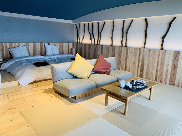 今年4月推出全新房型「紺碧」,房內設計了青藍色曲面天花板,陽光穿過窗戶照射進來會隨著曲面角度,反射出不同顏色,象徵被在地豐富自然所環抱的意象。裝潢使用土佐備長炭、土佐漆喰、土佐杉木等在地素材,步入房內即可欣賞美麗海景,連浴室都設置望海窗,可以一邊泡澡一邊聽著海浪聲。