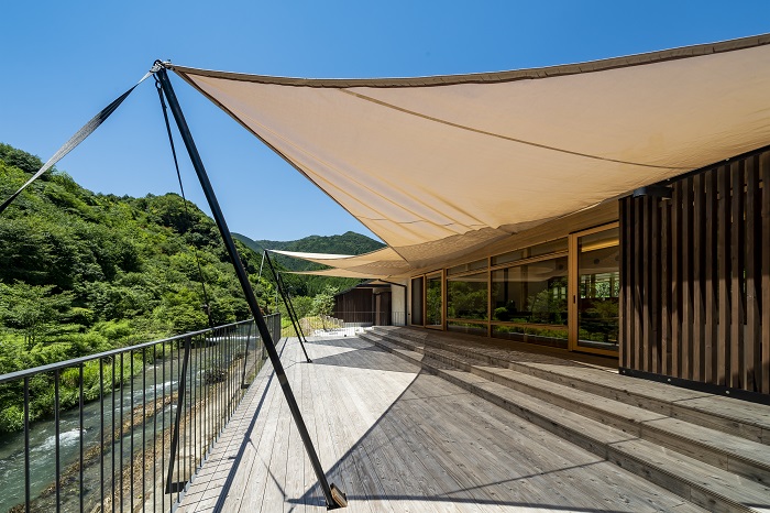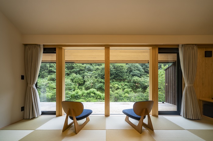 高知縣津野町有著群山圍繞的自然風景,為「四萬十川源流」所在地,吸引遊客探訪。「遊山四萬十 SEIRAN之里」主打親近四萬十川源流的大自然,於2021年7月重新開幕。入口庭園為牧野植物園監修,全棟以高知縣木材打造,所見之處充滿木質溫度與香氣,令人感到舒適安心。全房型附陽台,四萬十川從旁流經,潺潺流水聲讓人心曠神怡,館內隨著光照的角度不同 呈現出不同的風貌。