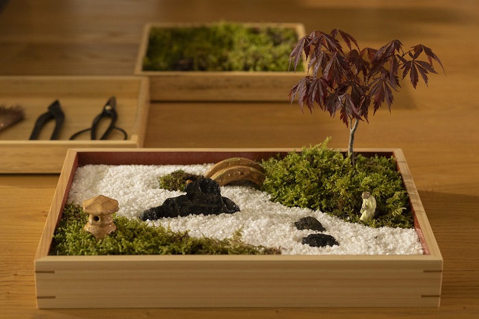 體驗將由負責虹夕諾雅 東京館內裝飾的盆景設計師勝亦友哉先生親自指導,老師會與您分享庭園盆景的歷史,講解製作步驟,帶領挑選盆栽與植栽品項,製作屬於自己的獨特庭園盆景。將土壤放入漆器盒子,並在裝入土壤時塑造出高低差,再種入紅葉與黃葉,調整苔蘚和石頭擺放位置,最後放入白沙。還可使用工具調整苔蘚的長度,或在沙子上畫出紋路,即可製作精緻又美麗的庭園盆景。