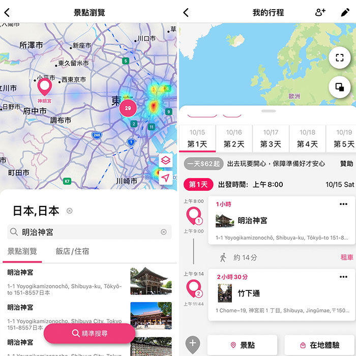 找到景點後,裡面還會有一些簡單的介紹。點跟點之間的移動方式,也都可以自訂,並且自動幫你預估時間,讓行程安排上更加輕鬆順利。