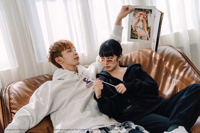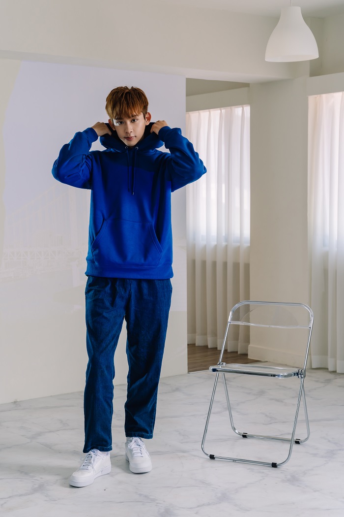 陳治廷則選擇同系列的深藍色「重磅休閒上衣」,搭配寬鬆有型的「打摺設計牛仔繭型褲」,藍白配色讓整個人看起來更為清爽大方。以同系列單品、不同色系的跳色選擇,讓情侶穿搭有更多搭配選擇,年輕活潑的造型絕對是大學生情侶的穿搭首選!