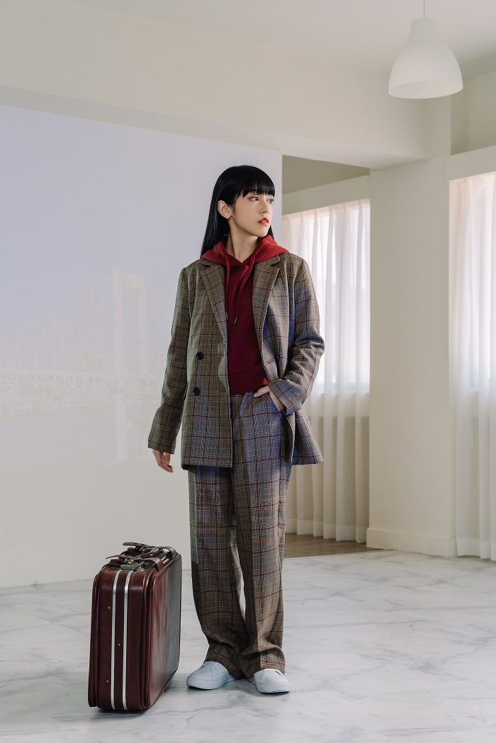 陳治廷以寶藍色的「休閒連帽上衣」作為穿搭重點,下身搭配「Chef Pants牛仔主廚褲」,透過同色系搭配讓全身造型更具整體感;Rin除了穿上酒紅色「短版休閒連帽上衣」,整套穿搭亮點則是以同款設計的「格紋雙排扣西裝外套」搭配「格紋中壓線高腰直筒褲」,為帽T的休閒感增加一抹知性優雅。