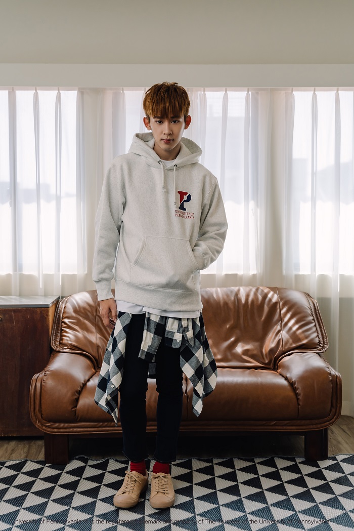 秋冬的代表色以灰、黑、白等沉穩低調色系最受喜愛,但不想讓整體穿搭過於暗色調,可以選擇搭配不同花色的單品或是亮色配件,點綴整體造型。陳治廷選擇賓夕法尼亞大學校徽印花款的「重磅休閒連帽上衣」搭配海軍藍「緊身牛仔褲」,腰間選擇綁上黑、灰、白相間的「純棉法蘭絨寬鬆襯衫」增添復古感,酒紅色襪子則是全身亮點,透過花紋及顏色變化創造穿搭層次。