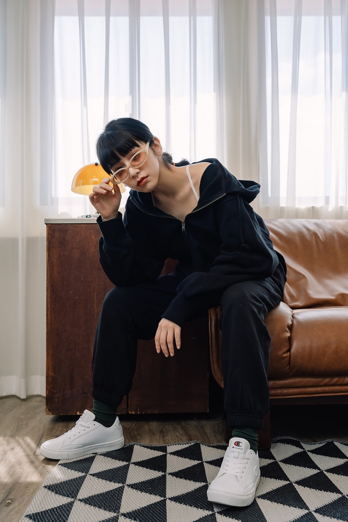 Rin透過同色系呼應男生穿搭,以男女適穿「重磅寬版休閒連帽拉鍊外套」搭配「休閒束口褲」,並以復古感十足的墨鏡作為點綴,打造俐落的黑色穿搭;而選擇不將拉鍊拉滿、微露領口的隨性態度,更展現冬日微辣個性魅力!
