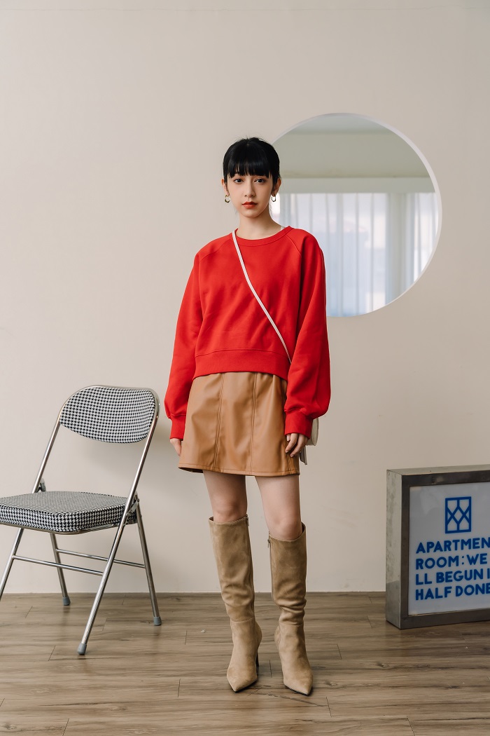 除了穿著同一款單品的情侶裝,不喜高調的情侶則可以運用相同風格或材質的單品,並以巧妙的跳色搭配,打造出獨特而低調的高級情侶穿搭!亮色系單品是Y2K風格不可缺少的要素,Rin挑選高飽和度色系的「短版休閒上衣」,恰到好處的蓬鬆寬袖增添可愛感,短版款式不僅俐落感十足,也讓身形比例更加完美;下身搭配短裙及長靴,明顯拉長腿部線條,還可搭配設計款斜背小包,或是具造型感的耳環、髮飾配件,讓造型更加分。