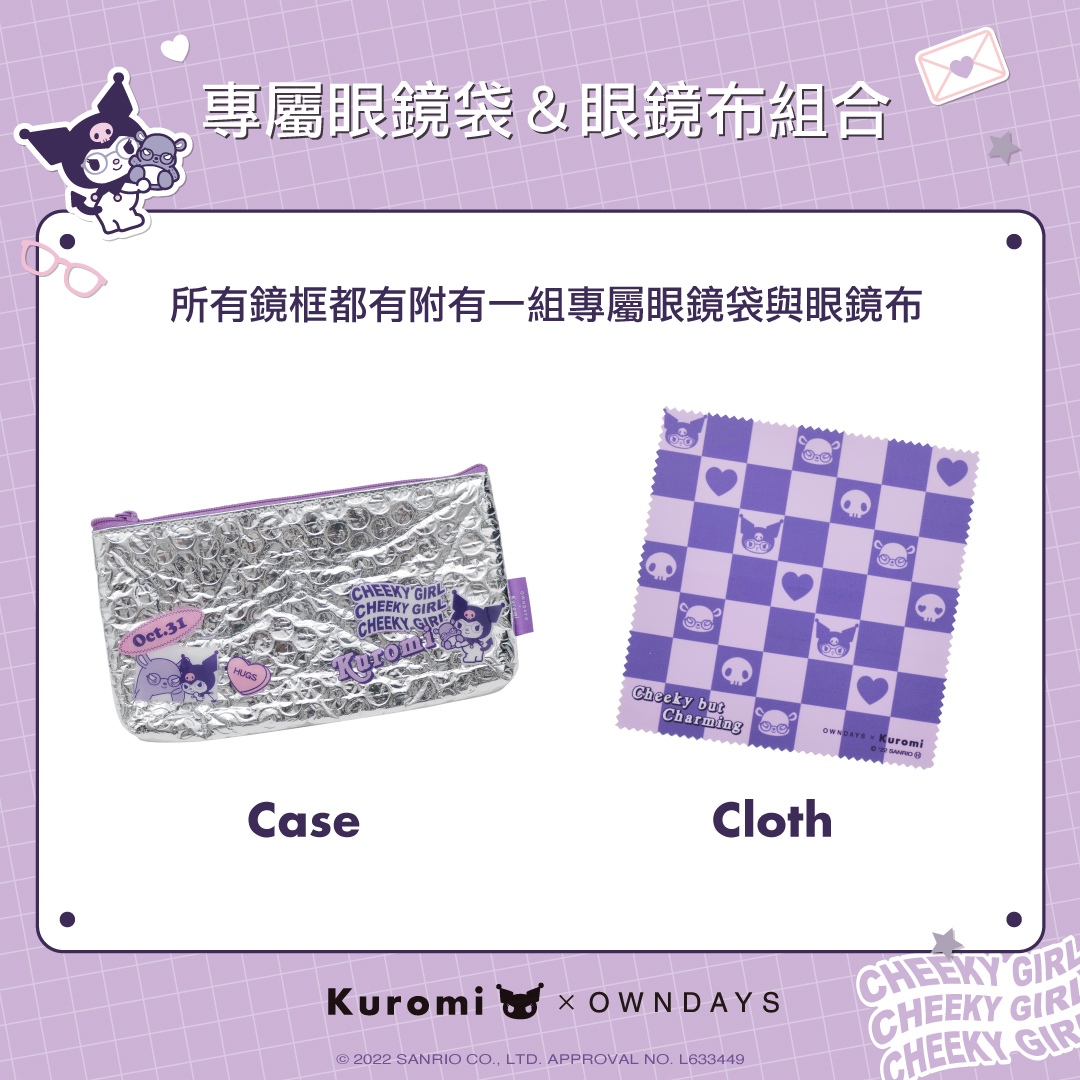 KUROMI酷洛米系列眼鏡於 10月21日在OWNDAYS全台店點上市,售價為NT$2,990及3,490元,凡於OWNDAYS門市或網路商店購買,即附贈角色專屬的眼鏡袋與眼鏡布,還可以獲得數量限定的酷洛米限定貼紙及極光外袋。