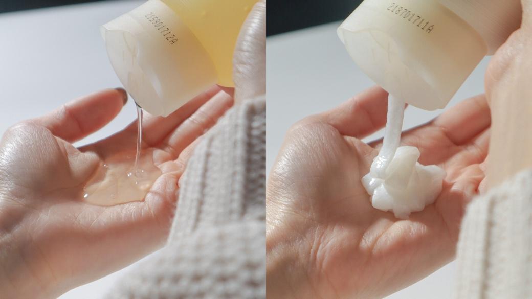 ※左為透明散發清香的洗髮露;右為乳霜般質地的護髮精華素