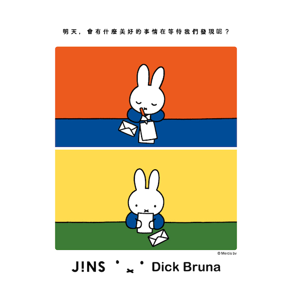 Dick Bruna的童書繪本,被推崇為「小孩的第一本繪本」,享譽國際,被翻譯為50國以上的語言,熱銷超過8500萬本以上。1964年在日本發行《小小的兔寶寶》後(福音館書店刊),自此成為廣為人知的跨世代人氣作品。近年,在日本因為育兒需求而接觸到Dick Bruna的大人們,紛紛感受到其作品的魅力轉而成為他的粉絲,JINS看準米飛兔的市場魅力,首次攜手Dick Bruna推出聯名眼鏡。