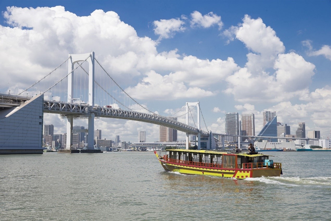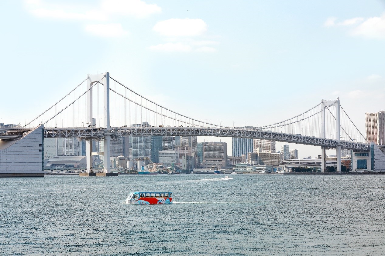 若是想要同時享受水陸的東京美景,就不能錯過水陸兩棲觀光巴士「SKY Duck」的體驗。東京都內目前有2條觀光路線,一條為「台場環景路線」,另外一條則為「東京晴空塔路線」。「台場環景路線」由台場SKY旅客中心出發,行經富士電視台與自由女神像附近,接著再由台場海濱公園的灣岸駛入東京灣。航程中的一大看點就是水陸巴士會鑽入彩虹大橋的橋下,讓旅客可以用不同視角來就近欣賞彩虹大橋的宏偉。