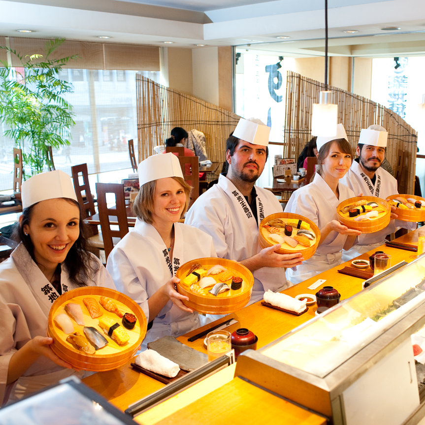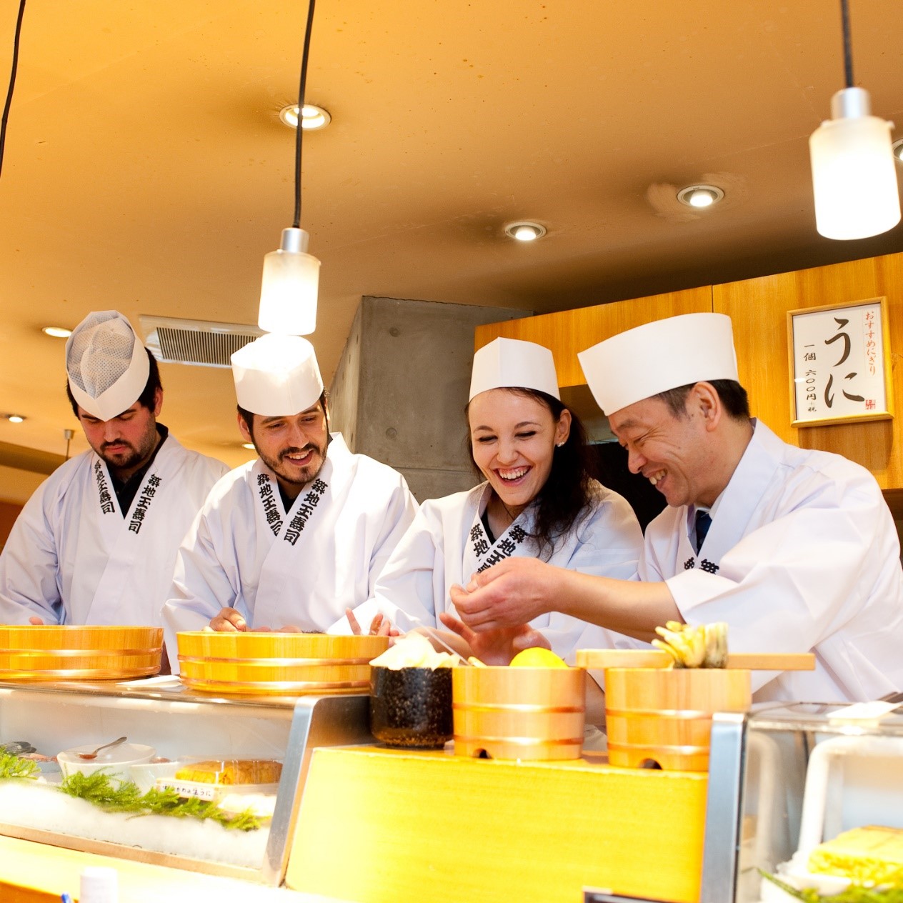 在各店鋪品嘗最新鮮的壽司料理之外,築地玉壽司晴海通店還提供兩種不同課程的握壽司製作體驗,報名參加的旅客在經驗老道的壽司職人解說指導下,穿上白色大袍站上壽司吧台上,享受著捏製握壽司、壽司手卷的製作趣味,也在課程中了解壽司歷史及食用壽司禮儀等,當然最後可以享用自己所製作的握壽司,大快朵頤。體驗完畢後,參加者還能獲得紀念照、壽司餐巾、浮世繪杯墊等伴手禮(伴手禮內容依現場所提供之物品為準)。