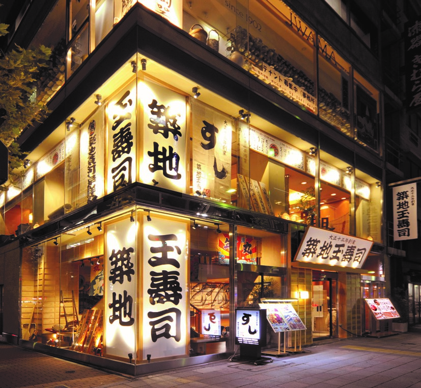 江戶前壽司連鎖店「築地玉壽司」創業於1924年,是世界(日本)首創壽司手卷的名店,目前主要展店於築地、銀座、池袋、新宿等東京都心人氣區域。在店裡可品嘗職人當日清晨從漁市場批入的漁貨所製成的新鮮握壽司,秘傳醬汁醃漬的醬醃鮪魚,以及細嫩鬆軟的醬煮星鰻等都是人氣品項。