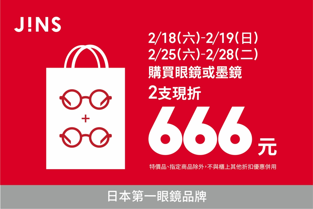 2023年2月還沒過完,第三個週末補班日又來了,為了緩解假日上班的憂鬱心情,JINS自2月18日(六)~2月19日(日)、2月25日(六)-2月28日(二)連續兩個週末,推出多支優惠活動,不論購買兩支光學眼鏡或兩支墨鏡,都能直接現折666元,自己買一搭一,還是揪親朋好友一起買都划算,買越多省越多,把握難得機會,在穿搭中加入時尚眼鏡,用全新造型化解補班的苦澀心情。