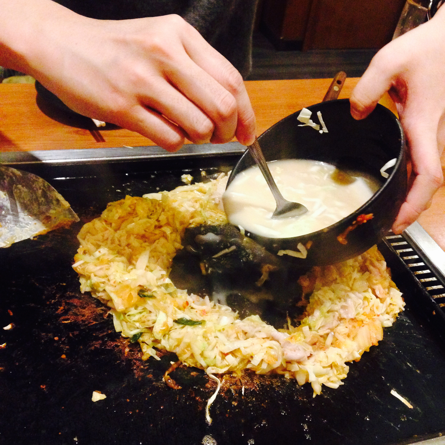 將麵糊像可麗餅一樣在鐵板上塗成圓形,然後把切成絲的高麗菜、豆芽菜、豬肉等食材分層疊上, 而翻面之後,夾在麵糊和鐵板之間的高麗菜被熱氣蒸熟,更能帶出高麗菜的甜味。