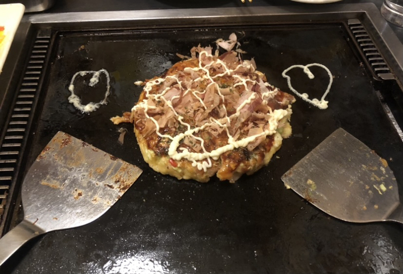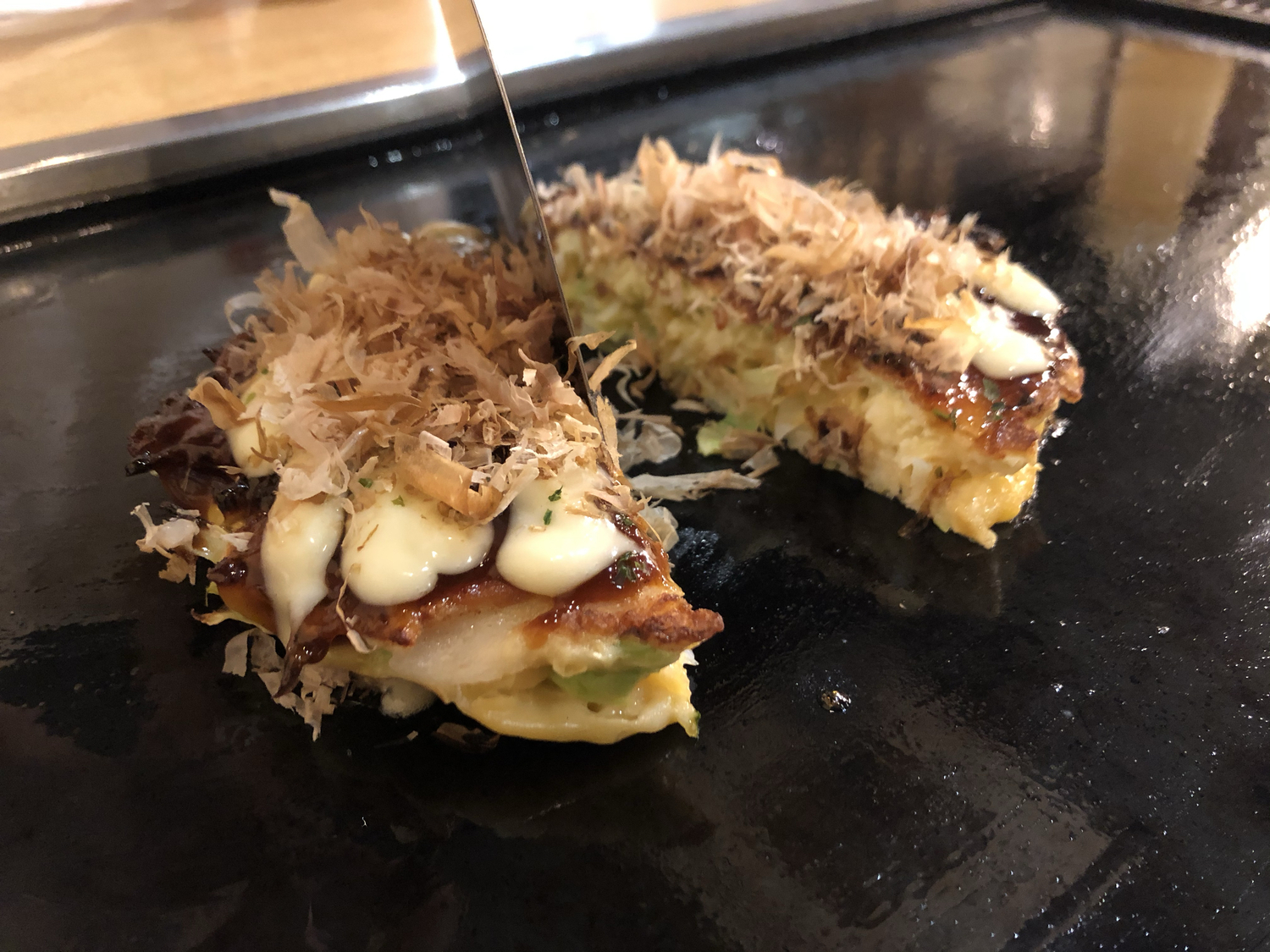 先將高麗菜、天羅婦花(天かす)等所有材料全部拌入麵糊混合在一起倒到鐵板,在上面放上豬肉、翻過來煎熟,最後加上醬汁、美乃滋、海苔粉跟柴魚片就完成了。