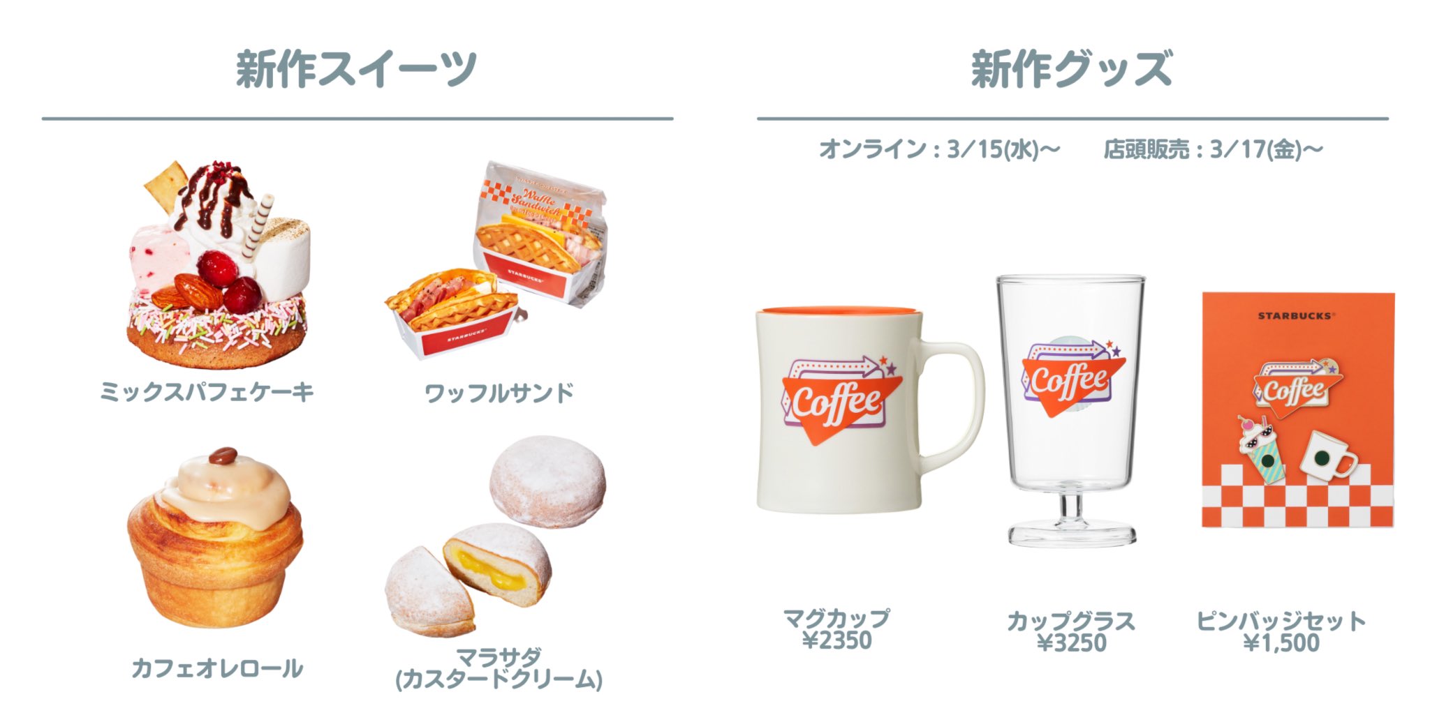 星巴克即將在未來分別推出四款糕點,分別是百匯蛋糕(暫譯)、鬆餅三明治(暫譯)、歐蕾咖啡蛋糕捲(暫譯)以及包裹著法式奶油的葡式甜甜圈(暫譯)(ミックスパフェケーキ、ワッフルサンド、カフェオレロール、マラサダ)。光是看到就讓人迫不及待的讓人口水都快滴下來了!