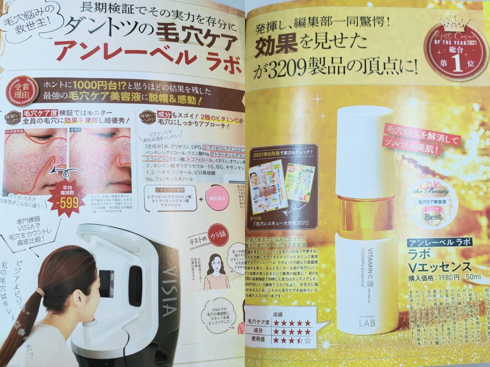 《LDK the beauty》(簡稱LDK)是日本行之有年的老牌情報雜誌,主打著無廠牌廣告介入的公正性,經常以客觀甚至毒舌的風格自行評比各保養美妝品項,比較各個保養產品的使用感數值與排名,可說是保養界的公道伯。而這樣嚴厲公正的LDK雜誌,在2021年時竄出了一匹黑馬打敗了3208個同樣性質的美容液商品,榮登評測「毛孔清潔美容液(毛穴ケア美容液)」第一寶座,甚至連續五連冠奪得殊榮,這匹黑馬正是由unlabel LAB「安博士肌膚學院(以下簡稱安博士)」推出的超快毛孔清零維他命VC美容液。