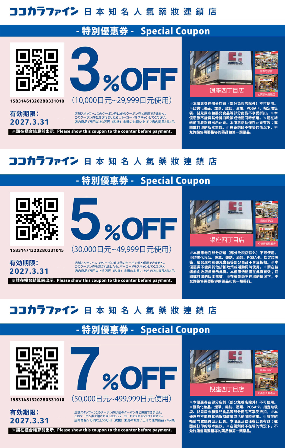 ■ COCOKARA FINE 關空店、COCOKARA FINE 關空出國專區店、COCOKARA FINE 關空第2航站樓店、COCOKARA FINE那霸空港店等部分免稅店無法使用此優惠。