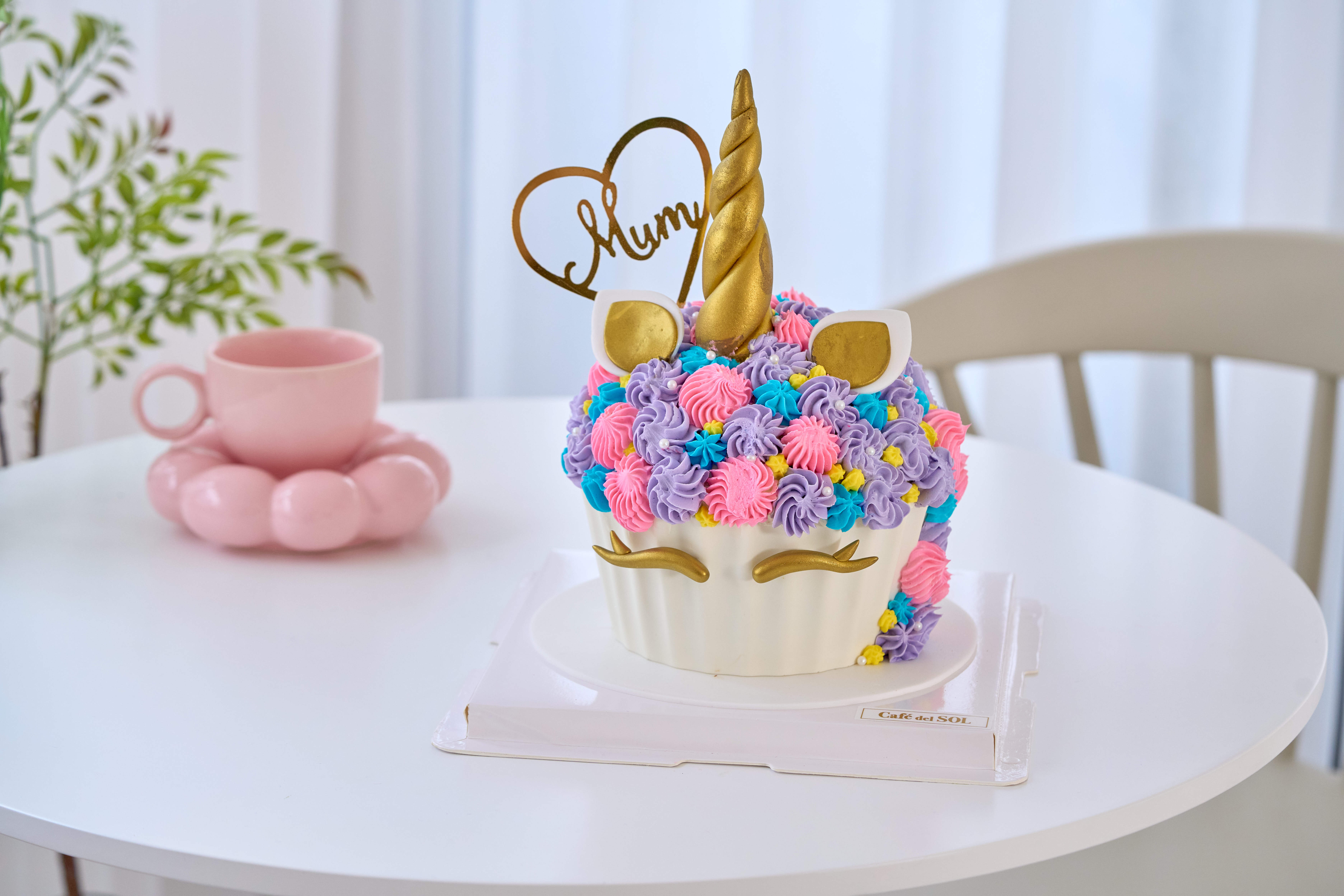 如果媽咪擁有少女心,夢幻款式首推這款以獨角獸為造型的玉響。童話。師傅這次在造型發想上跳脫框架,將風格獨特的獨角獸元素融入至蛋糕。以各種不同的色調和翻糖捏塑出來的獨角獸,高雅俏皮、繽紛滿點。