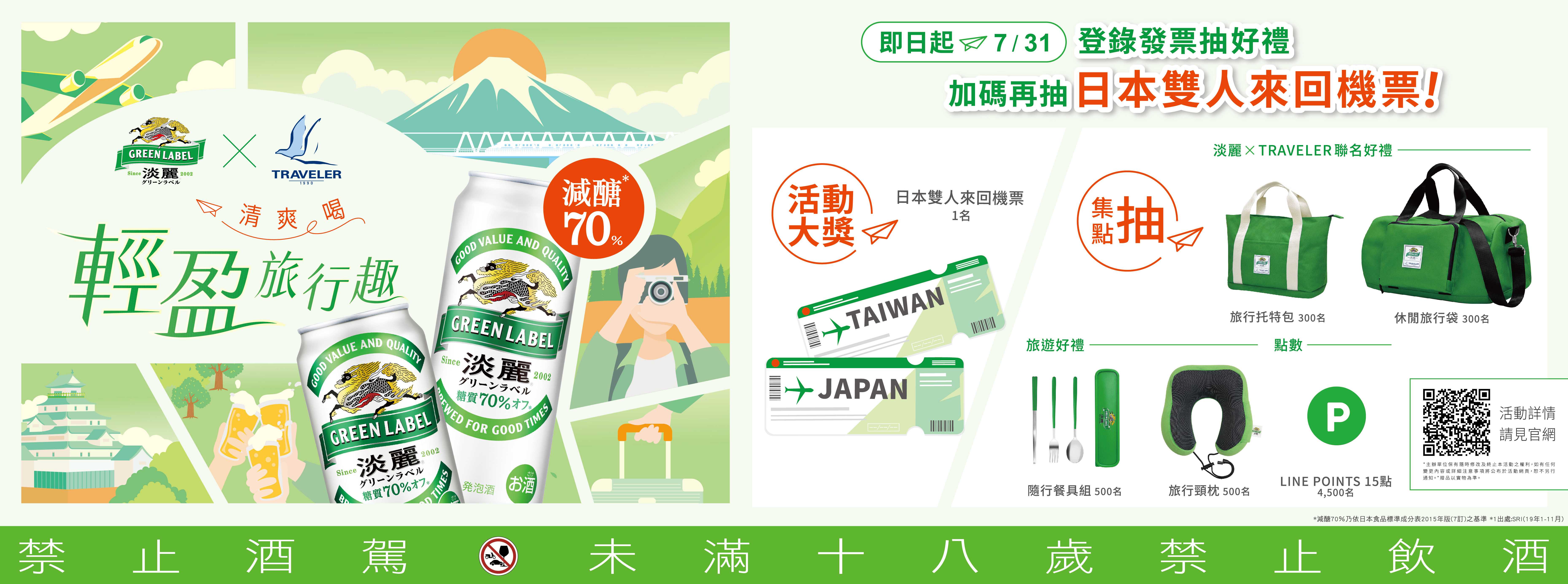 KIRIN淡麗GREEN LABEL 推出「清爽喝 輕盈旅行趣」活動,5月1日至7月31日凡購買淡麗GREEN LABEL啤酒系列商品,登錄發票就有機會獲得日本雙人來回機票及精美聯名旅遊好物。