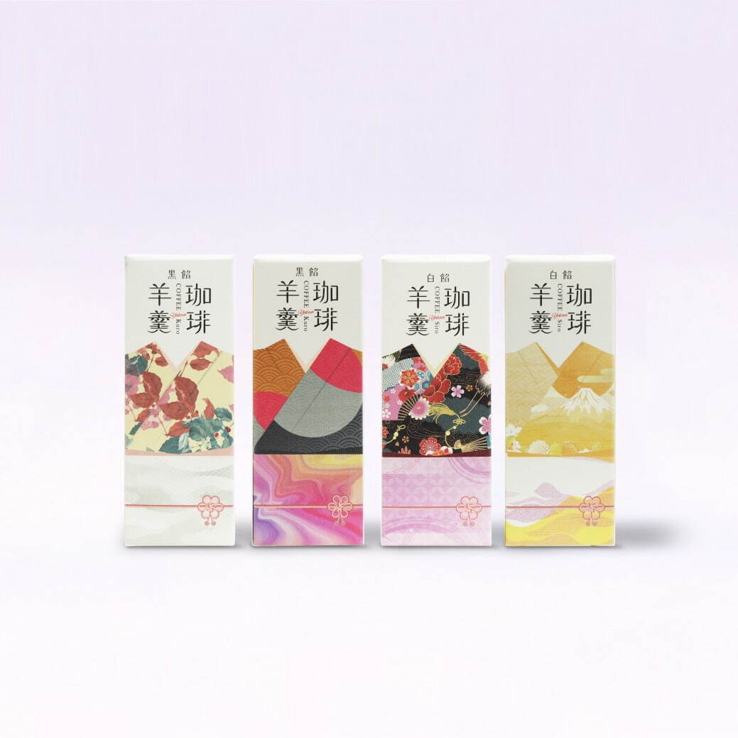 咖啡羊羹是將來自哥倫比亞、厄瓜多爾等地的精選咖啡豆的混合物混入白餡和黑餡中,每一口羊羹都可以吃到淡淡的咖啡香,它分成白餡與黑餡,並各有兩種和服可愛包裝。