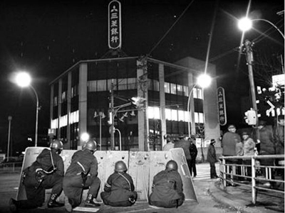 大阪府警察署意識到大事不妙,趕緊加派警力前往支援,不知道是遲遲等不到5000萬,或是已經被包圍的緣故,梅川乾脆就放棄了逃亡,以三菱銀行的行員們以及客人作為要脅,拉下了銀行的鐵門,與警方展開了持久的對峙。