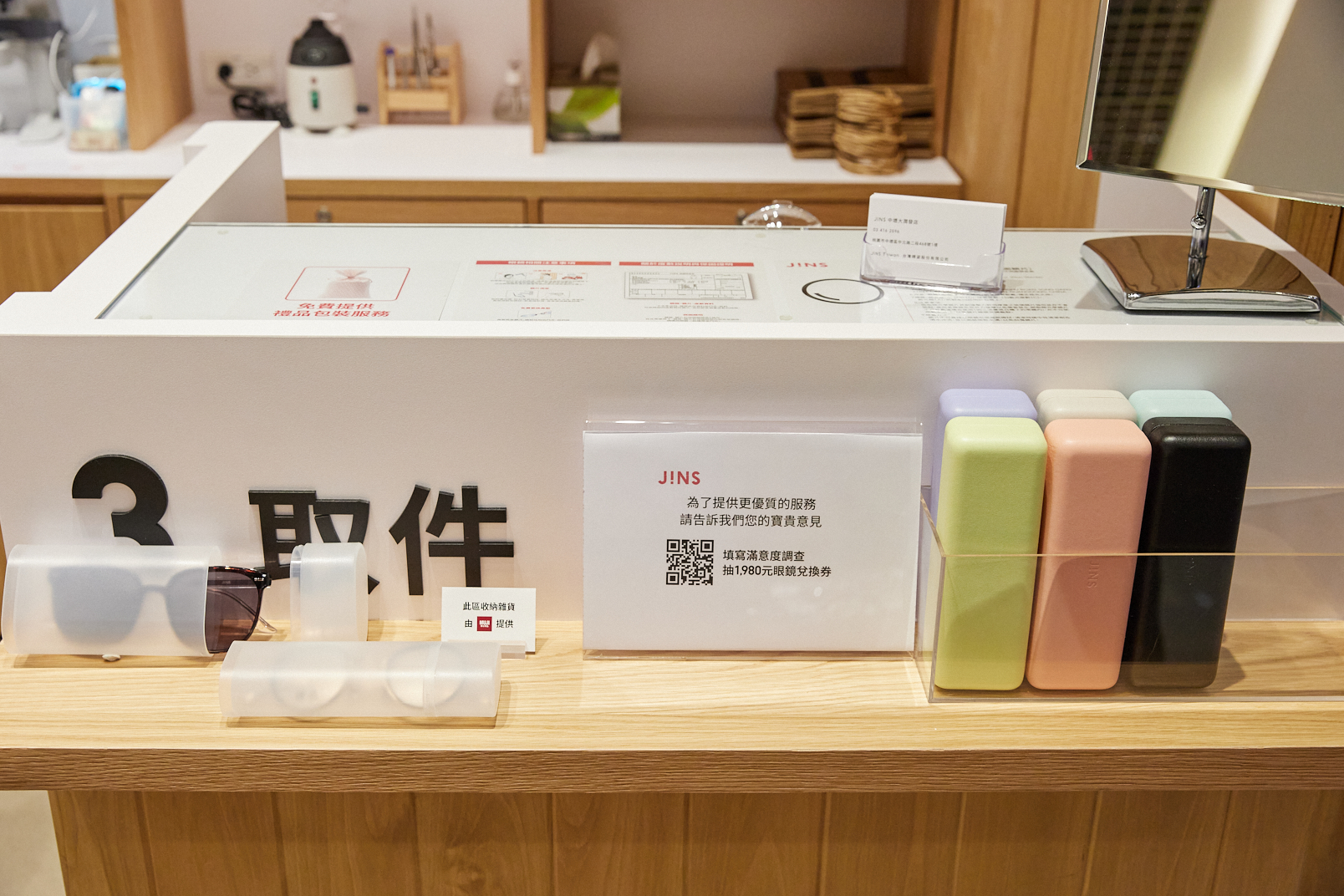 不僅環境氛圍能充分感受到雙品牌所帶來的各式各樣生活美學,產品與服務層面也展現互補及合作精神,例如:MUJI無印良品廣受好評的收納盒,設計簡約且實用,可用來收納JINS多種風格或功能眼鏡,還具有展示功能,可替生活增添一些儀式感;MUJI無印良品的顧客服務台,則擺放JINS老花眼鏡,便民服務,讓有需要的顧客,諮詢時不用擔心看不清楚問題。