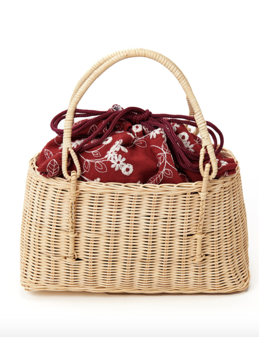 類似束口袋造型的小包袋,日文稱為「巾着(きんちゃく)」,可將隨身小物裝入方便攜帶,和浴衣搭配看起來相當可愛,以不同的巾着花色同時展現日系時髦感受,或者以素色、蕾絲的巾着外型,可以為穿搭注入優雅的高級感,另外也有巾着外加上藤編包的款式,也是近期非常推薦的必買包款。
