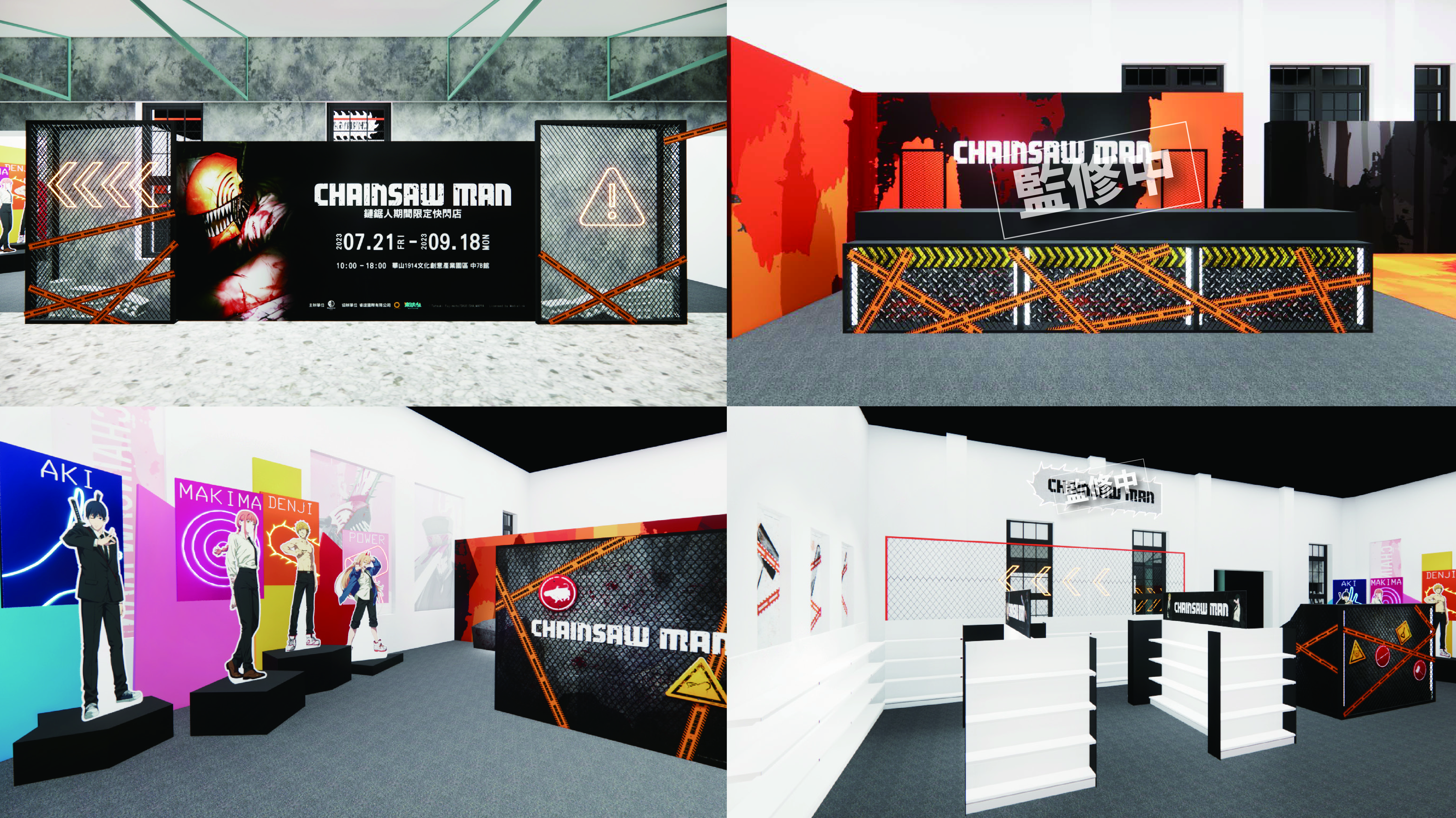 本次的《鏈鋸人》快閃活動整體以潮牌概念設計,顛覆既往動漫快閃店的形象,完美結合《鏈鋸人》的狂氣畫風、惡魔美學和時尚潮流,不論你是動畫黨還是漫畫黨絕對都能被征服。展場內不但有人氣必拍的角色牆,讓粉絲們能跟主角們合照;還有《鏈鋸人》快閃店主景搭配光影設計霸氣登場,讓你置身在《鏈鋸人》快閃店的震撼魅力中。