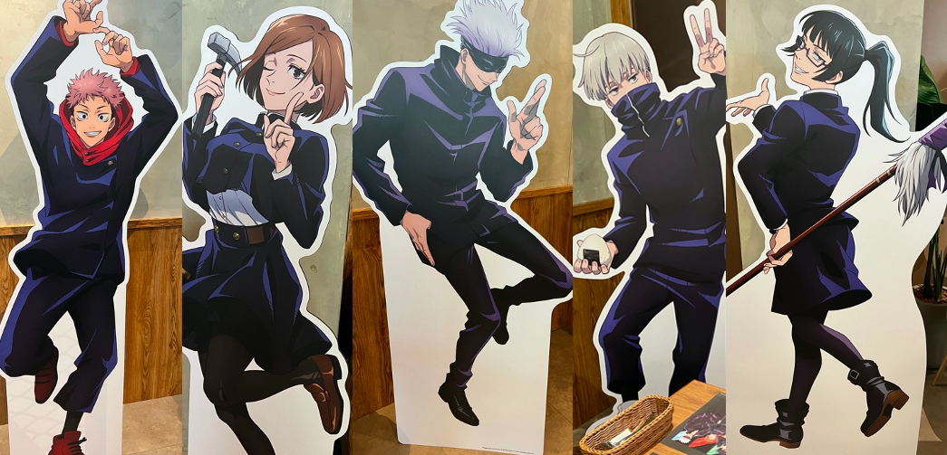 想成為術師,高專絕對是成長的必經之路!這次將「歐拉歐拉オラオラ」的大門化身為咒術高專校門,一進到內部就可以看到壓制咒物的封印條燈營造的氛圍感,轉角處更有詛咒之王-「兩面宿儺」使出領域「伏魔御廚子」所散落的牛隻骨骸,散發著宿儺的強大與霸氣!往內側座位區域移動,不僅有每個粉絲都難以忘記的經典名場面:虎杖悠仁被「處以死刑的房間」讓大家打卡拍照進入情境,更有伏黑惠、釘崎野薔薇、五條悟、狗卷棘等眾多角色立牌陪伴一同用餐。