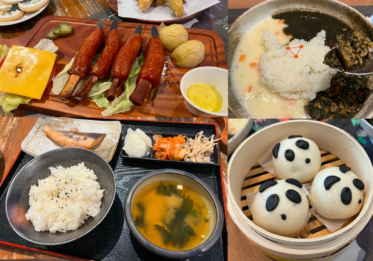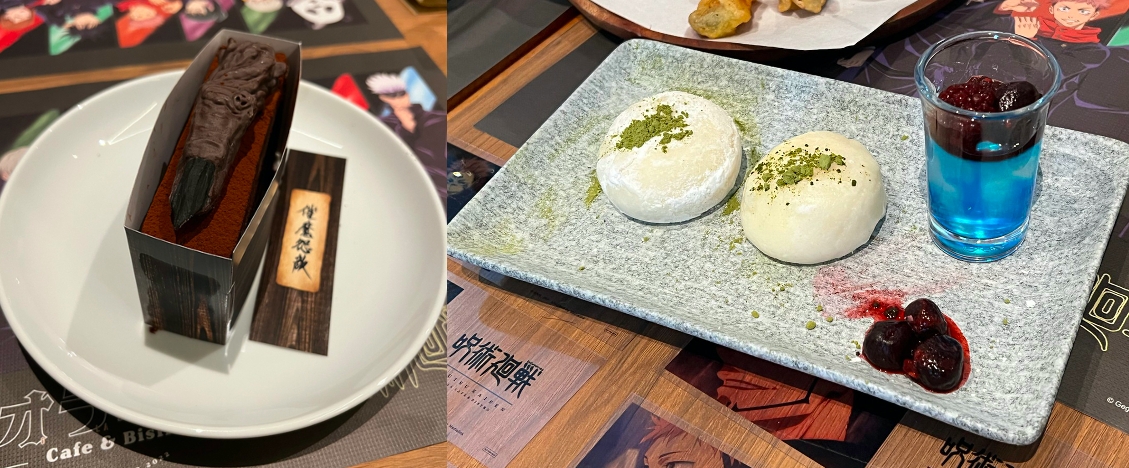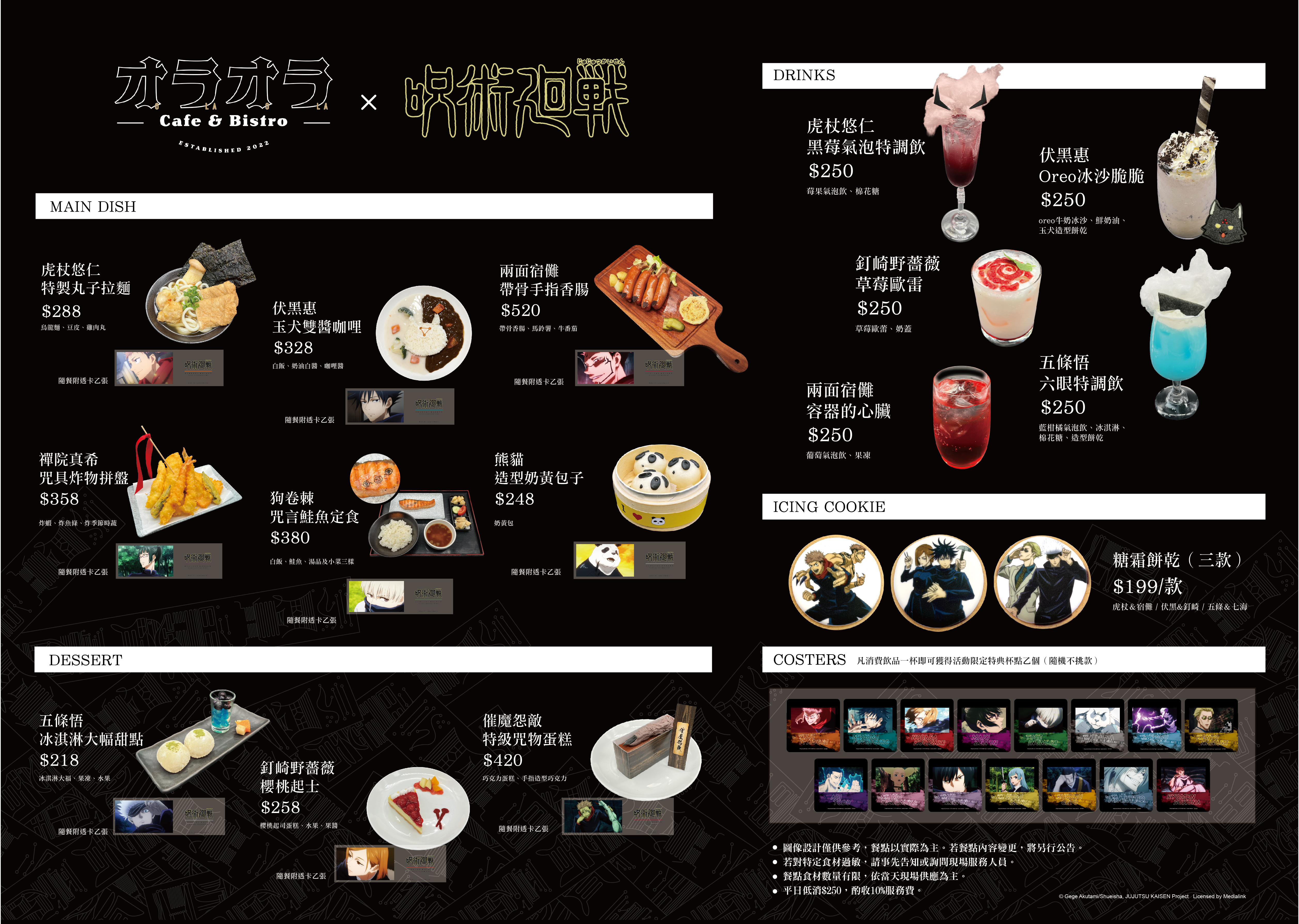 店內除了還原場景與角色立牌外,更是推出以人物特色發想設計的主題餐點,這次共有四道主餐、兩道點心、四種甜點及四款飲品。主餐有著虎杖悠仁喜愛的麵類食物「虎杖特製丸子拉麵」、式神中人氣超高的「伏黑惠玉犬雙醬咖哩」、充滿惡意的詛咒之王「兩面宿儺手指帶骨香腸」以及大家最喜歡的咒言師學長「狗卷棘咒言鮭魚定食」。點心的部分有著可愛外表的「熊貓造型奶黃包子」、以咒具為設計的「禪院真希咒具炸物拼盤」。