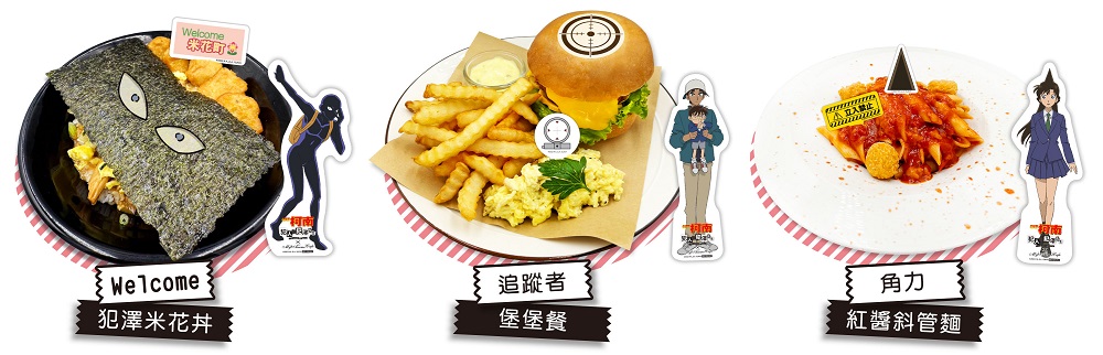 《名偵探柯南 犯人.犯澤先生》推出多款主題蔬食餐點,例如給犯澤先生的「Welcome犯澤米花丼」、緊追犯澤先生謎樣雙人組的「追蹤者堡堡餐」、以及結合米花市的兇案印象及全作最強火力的「角力紅醬斜管麵」,粉絲們只要看到餐點與特典的組合,相信都能會心一笑。另外針對劇情及作品風格設計的「血紅野莓優格聖代」、「米花名物爆炸聖代」、「派對咖繽紛布朗尼」、「幸福相遇波士頓派」等等餐點,以及10款角色飲品,絕對給你最有趣的用餐新體驗!