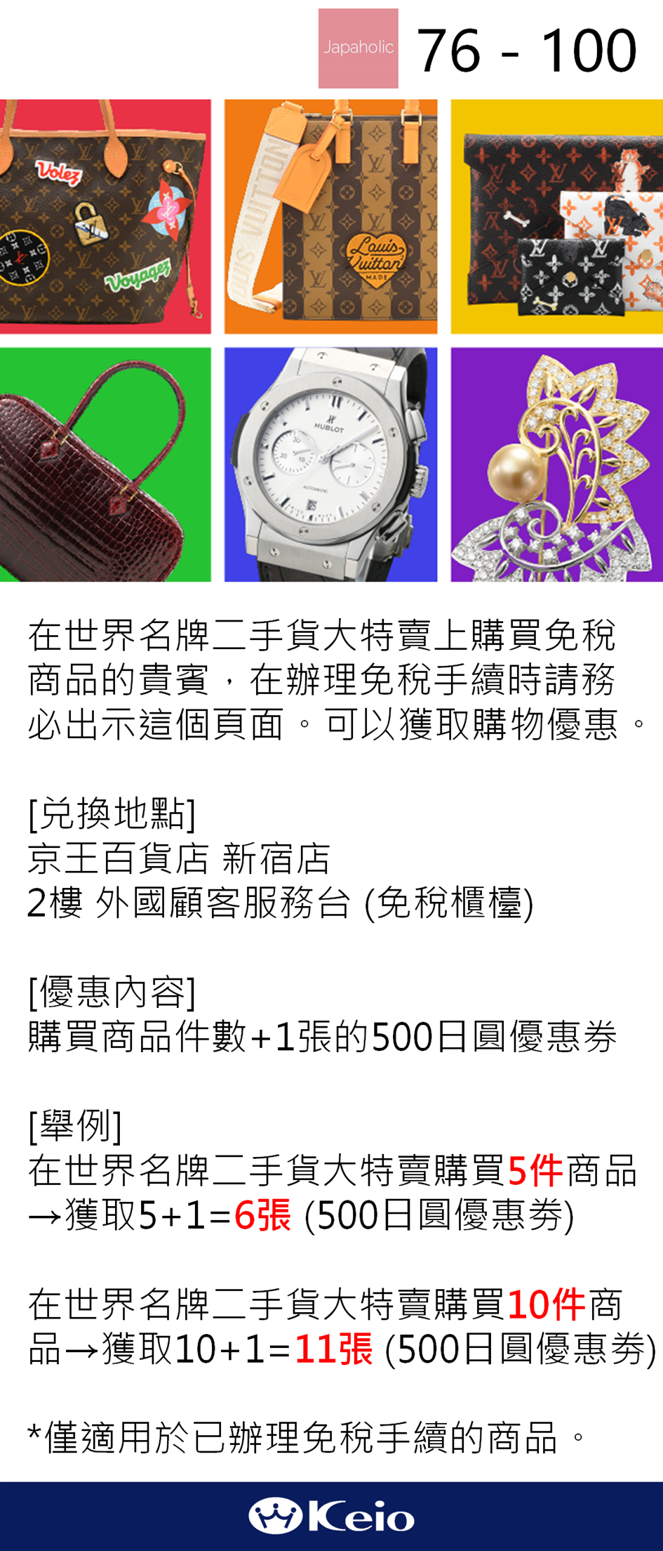 在每年的四月和十月,都會在京王百貨新宿店舉行為期一週的「世界名牌二手貨大特賣」,聚集15家以上的品牌,包括Louis Vuitton、Hermes、Gucci、Celine和Loewe等眾多名牌精品,不只有包包皮夾錢包,還有手錶、珠寶飾品等,每年都吸引了不少想撿便宜的日本顧客以及海外遊客。