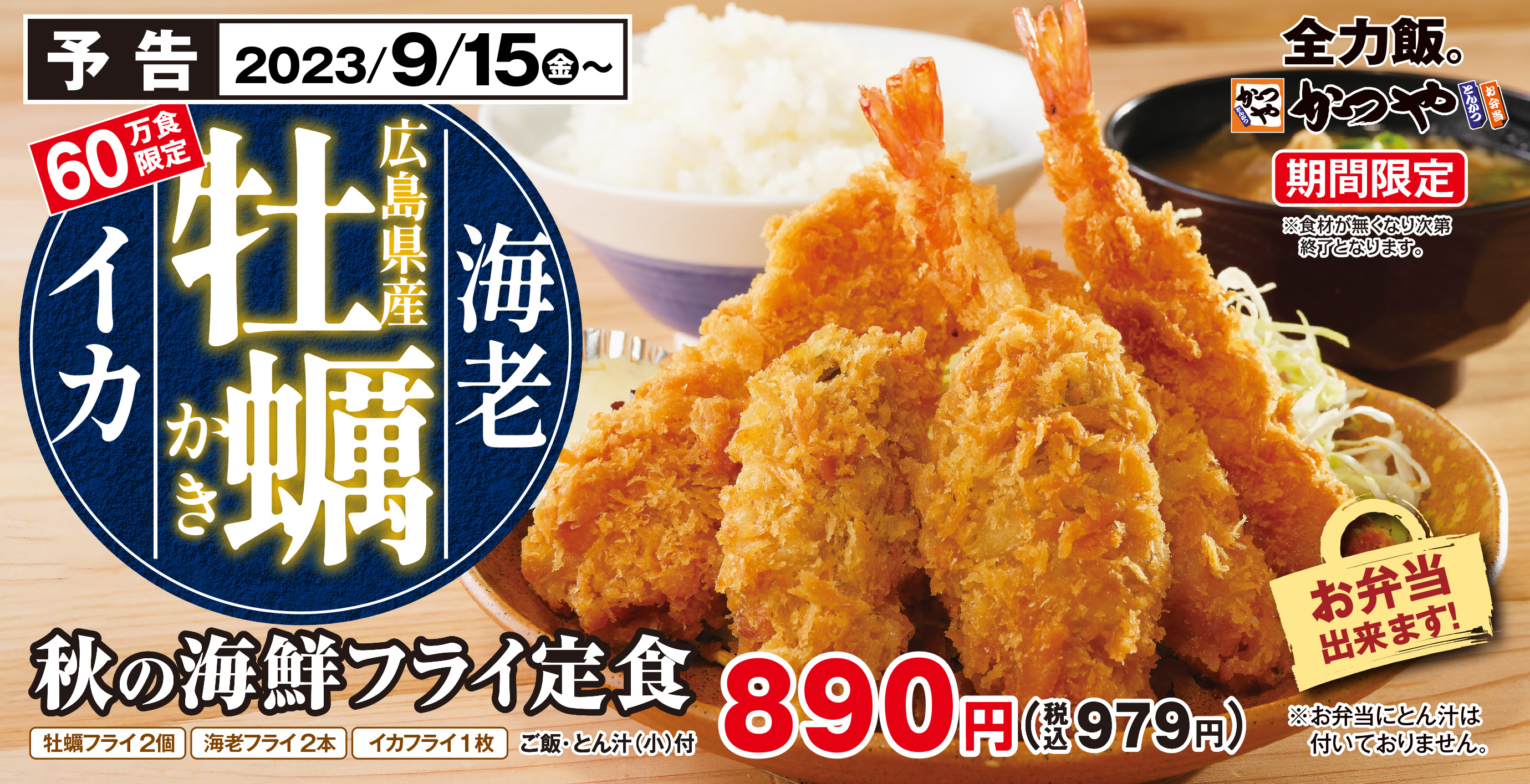 除此之外,為了一些不方便內用的顧客,只有近期能夠享用到的「秋季酥炸海鮮定食」以及「廣島產炸牡蠣」也推出了方便攜帶且能夠保存其美味的外帶及便當版本供顧客購買。