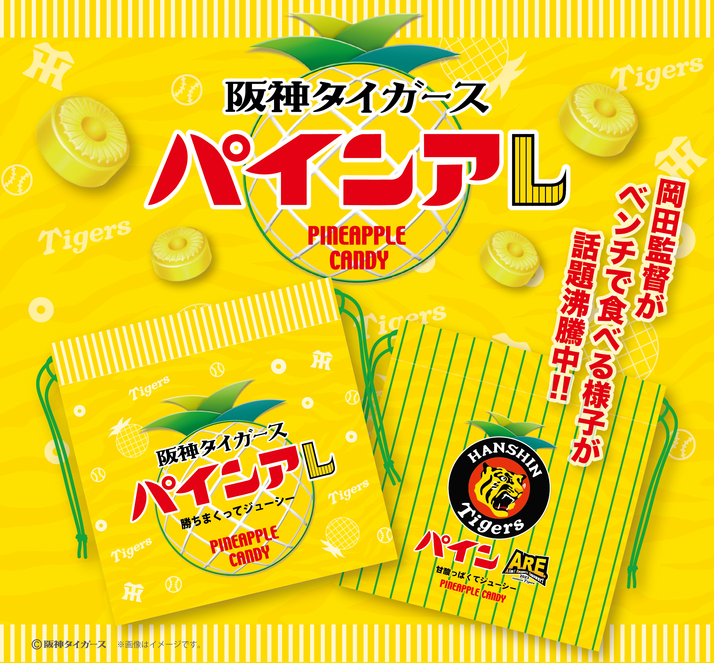 首先從鳳梨的部分來說明。會選擇鳳梨的最大原因就是阪神職棒隊的監督岡田彰布非常非常喜歡吃鳳梨糖果,他也有多次被目睹到在球賽的休息區內享用著鳳梨糖果的畫面。因此這一次阪神隊才會選擇在奪冠時推出這樣的商品。但是,那為什麼不直接一點叫做阪神鳳梨糖果就好呢?