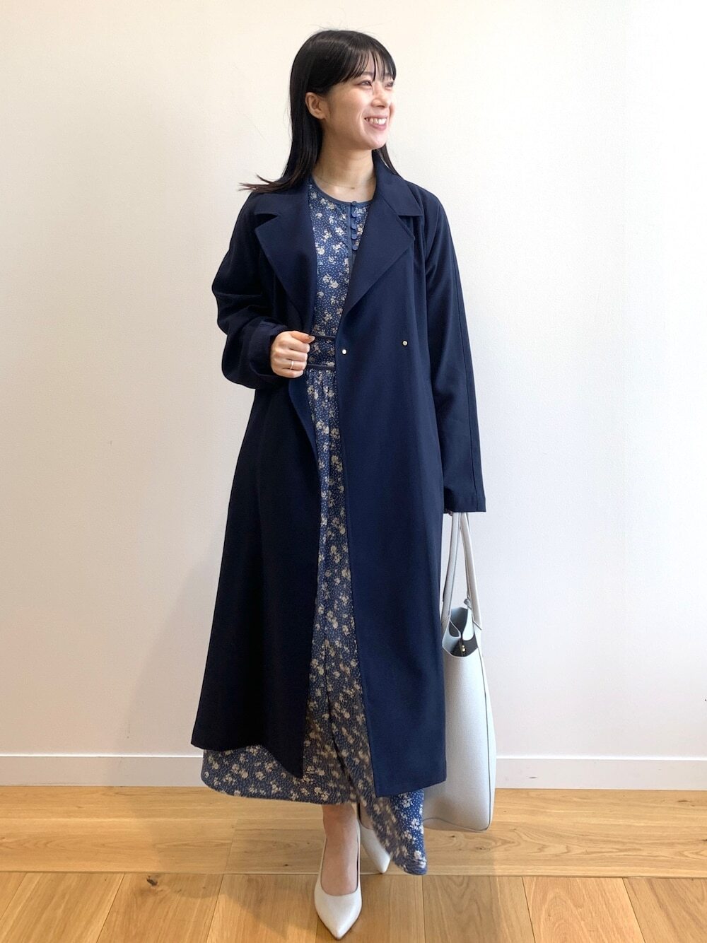 不分季節皆可穿著的碎花洋裝,從春夏一路穿到秋天使單品活用性更高,結合同樣是長版設計的風衣外套加乘,為造型突顯優雅大方的氛圍,融入方頭平底鞋提升輕復古 Look ,換上尖頭高跟鞋便能帶來日系優雅氣質。