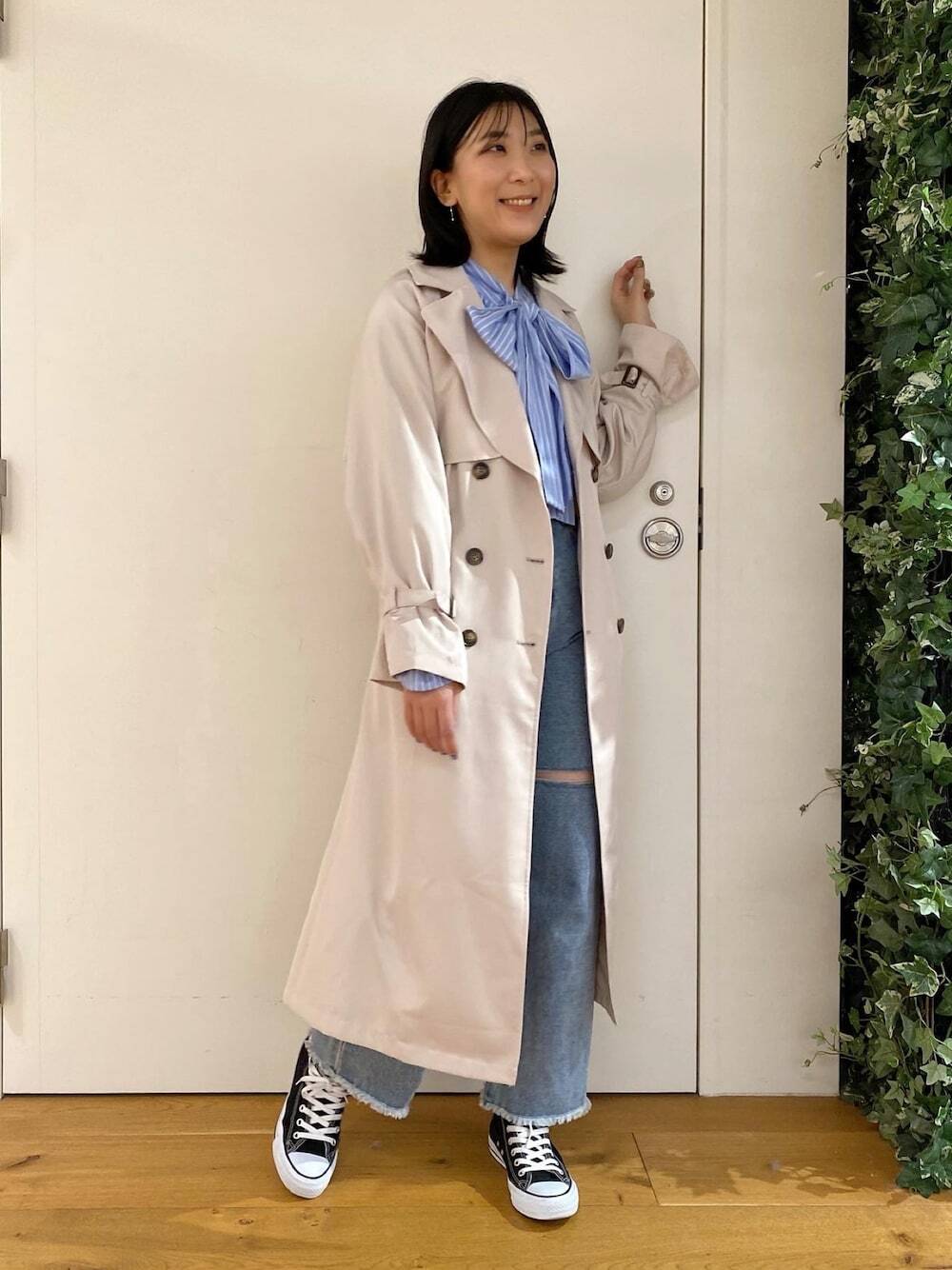 當外出懶得想搭配,風衣外套絕對是此時必備的造型幫手,長版風衣外套不僅能快速注入時髦感之外,修飾版型能讓比例顯瘦又顯高,隨性混搭白 TEE 和牛仔褲,展現休閒慵懶的日常 Look ,如果想使穿搭更加分,利用外套疊搭技巧,連結專屬魅力的日系個性。