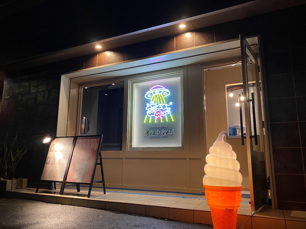 今年春季開幕「真夜中牧場」,緊鄰押上站,距離東京晴空塔很近,到晴空塔遊覽或夜遊都很適合到該店大快朵頤一番。店鋪霓虹的招牌繪著UFO與乳牛,意味著「好吃到要被UFO吸走啦!」,獨特的創意趣味十足。